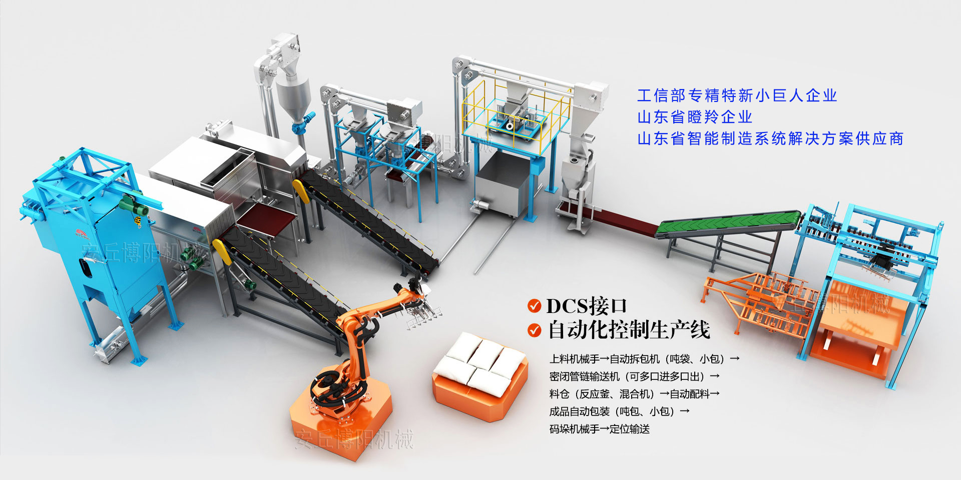 噸袋拆包機+自動拆包機+智能拆包機+拆包機器人→管鏈輸送機→反應釜投料機器人+料倉